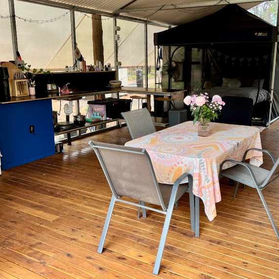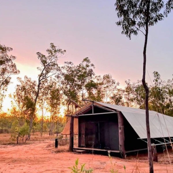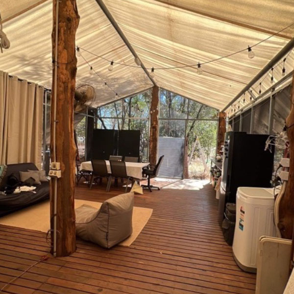 Balabala is a term which refers to a traditional bark shade structure. They have evolved to feature a canvas tarp shade, wooden and steel poles and steel mesh screening. The buildings have no solid walls to ensure they’ve got maximum airflow. There are lights, ceiling fans, a composting loo and shower, as well as a small kitchen with a gas stove. The balabala’s are fully furnished, including all white-goods and WiFi.
